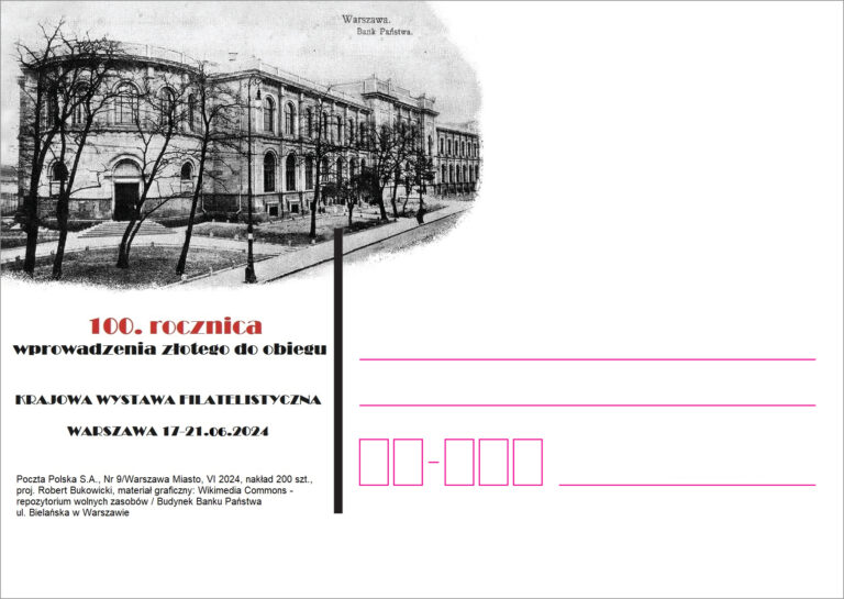 100. rocznica wprowadzenia złotego do obiegu. Krajowa Wystawa Filatelistyczna Warszawa 17-21.06.2024