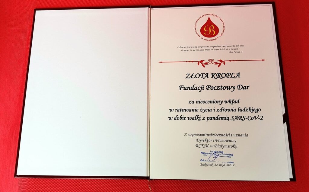 W ostatnim czasie Fundacja „Pocztowy Dar” otrzymała nagrodę specjalną Dyrektora Regionalnego Centrum Krwiodawstwa i Krwiolecznictwa w Białymstoku – „Złota Kropla”. To szczególne wyróżnienie zostało jej przyznane za wkład w ratowanie zdrowia i życia ludzkiego w czasie epidemii koronawirusa.