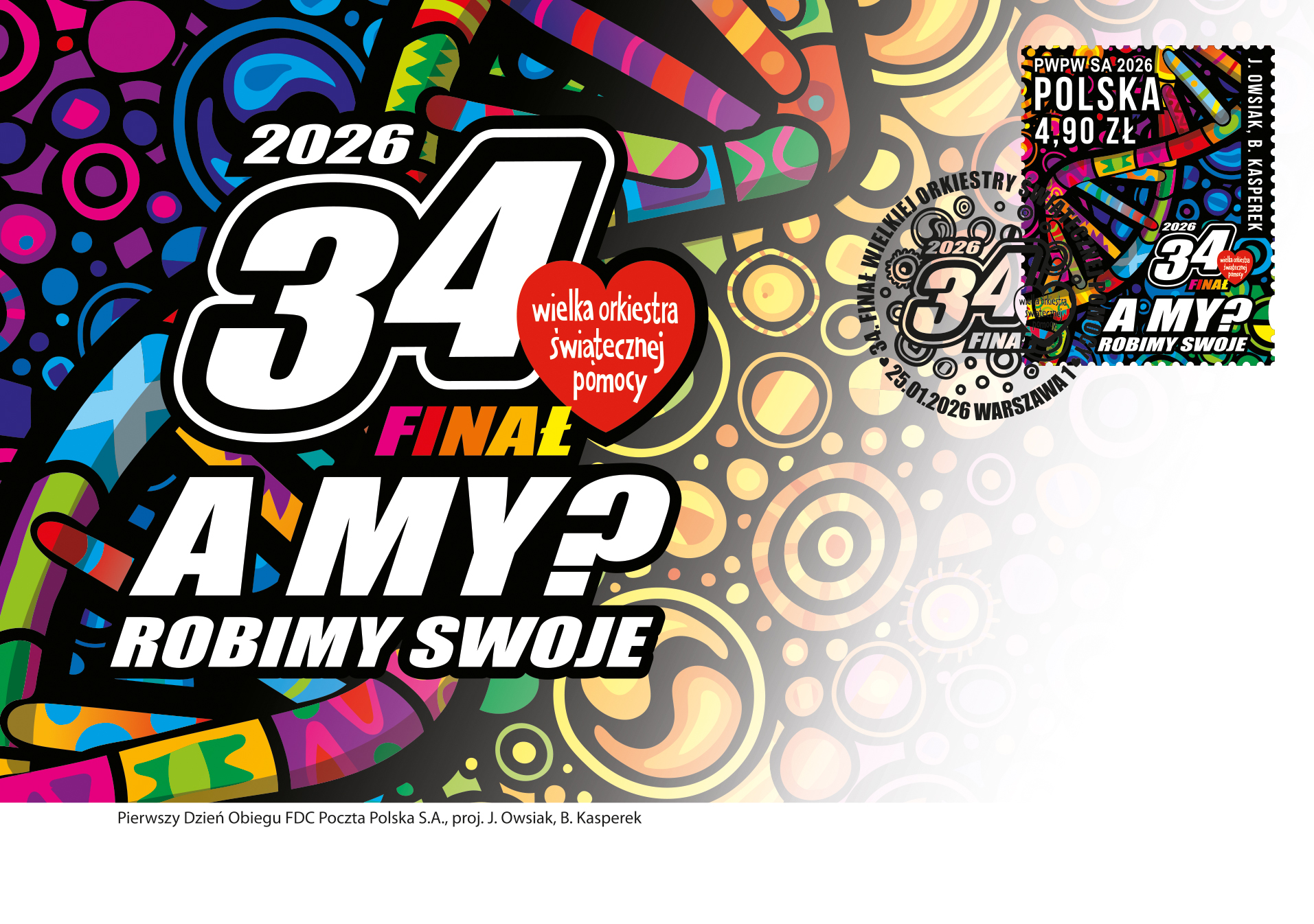 – Znaczek pocztowy wrócił na dobre jako element finału Wielkiej Orkiestry Świątecznej Pomocy! Znaczek 34. Finału WOŚP to kolor, zawijasy w kodach DNA i mnóstwo innych form życia we wszystkich barwach świata – właśnie tak opowiadamy o zdrowych brzuszkach naszych dzieci, czyli gastroenterologii dziecięcej. Tym znaczkiem mówimy też „A my? Robimy swoje”, bo tak właśnie działa Orkiestra – każdego dnia myśli o pomaganiu i robi swoje przez 365 dni w roku. I to działanie jest naszą wielką siłą! – mówi Jurek Owsiak, Prezes Zarządu Fundacji WOŚP.