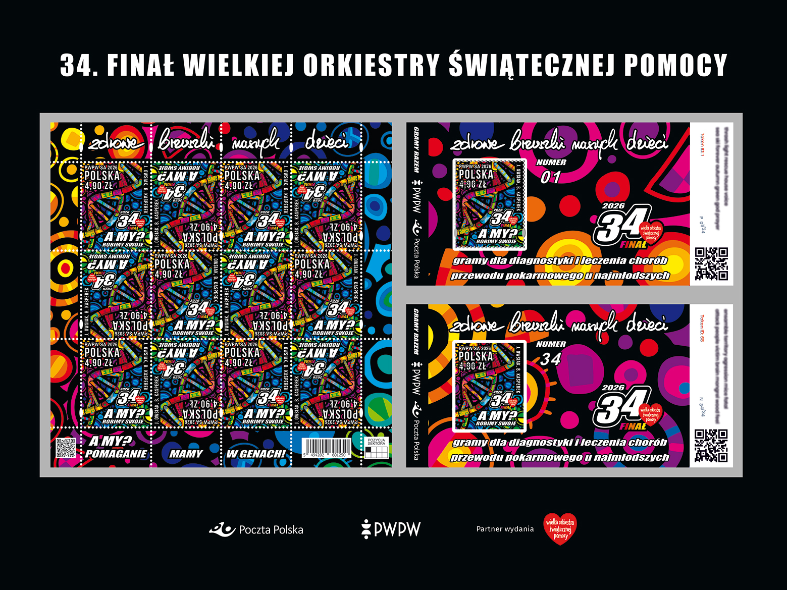 Przed nami 34. finał Wielkiej Orkiestry Świątecznej Pomocy. Zebrane środki tym razem zostaną przeznaczone na wsparcie diagnostyki i leczenia chorób przewodu pokarmowego dzieci. Już po raz kolejny Poczta Polska wyemituje specjalny znaczek, który został zaprojektowany przez Jerzego Owsiaka i Barbarę Kasperek, a wyprodukowany przez Polską Wytwórnię Papierów Wartościowych.
